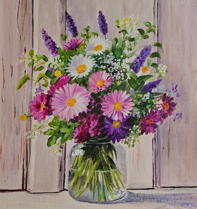 Malowanie bukietu w wazonie farbami akrylowymi.