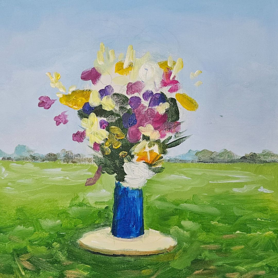 Malowanie kolejnych kolorów w pejzażu. Dodawanie szczegółów bukietu i wazonu.